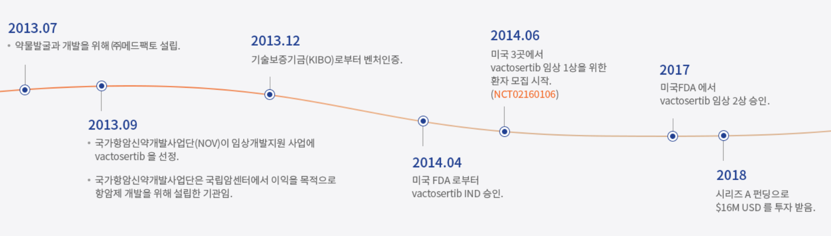 메드팩토는 골수이형성증에 대한 미국 백토서팁 단독 임상 1·2상 뿐 아니라 머크(키트루다), 아스트라제네카(임핀지) 등을 비롯한 유수의 글로벌제약사, 연구기관과 병용 임상을 진행 중이며, 2018~2019년초 동안 약 400억원 규모의 투자유치도 성공했다.