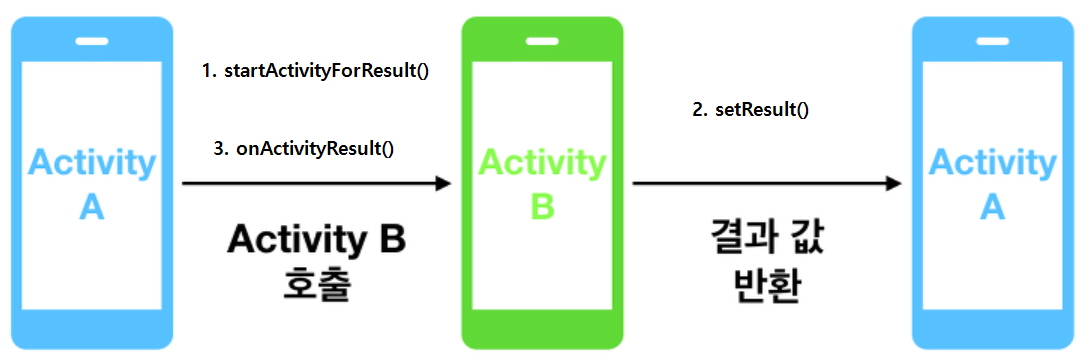 - 화면을 구성하다보면, 액티비티간 이동을 A→B→A 이렇게 할 때가 있다. 위의 startActivity()을 할 경우, 사용자가 '뒤로가기' 버튼을 누르는 거나, 앱을 내렸다가 다시 화면을 띄우는 과정에서 예상치 못한 상황으로 결과를 잘못 받을 경우가 있어, startActivity() 대신 startActivityForResult()메소드 이용하고, B는 setResult()로 결과 전송하고, A는 onActivityResult() 콜백 메소드가 호출되어, 전달받은 데이터를 받도록 처리해야 한다.