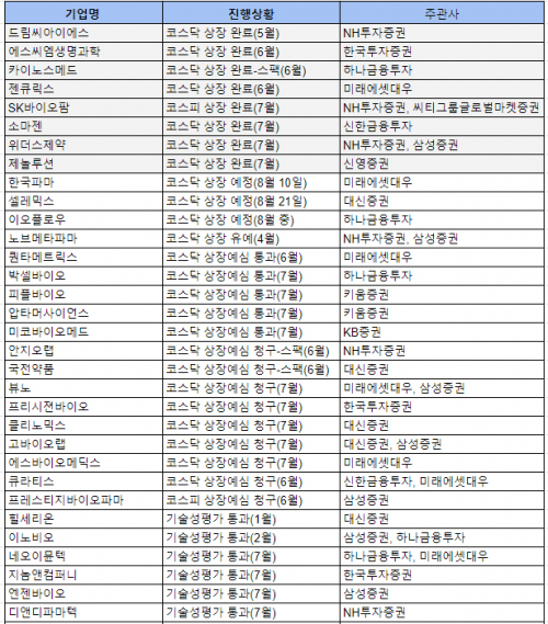 코스닥 기술특례 상장을 위한 기술성평가를 통과한 기업도 최소 6곳으로 7월만 4곳(네오이뮨텍, 지놈앤컴퍼니, 엔젠바이오, 디앤디파마텍)에 이른다. 네오이뮨텍의 경우 코스닥 상장예비심사 청구가 임박한 것으로 알려졌다.