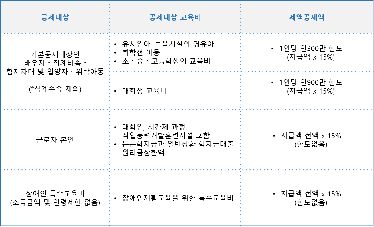 ◇ 교육비 : 취학전 아동, 초.중.고생, 대학생 자녀의 교육비는 지출 15%한도로 공제