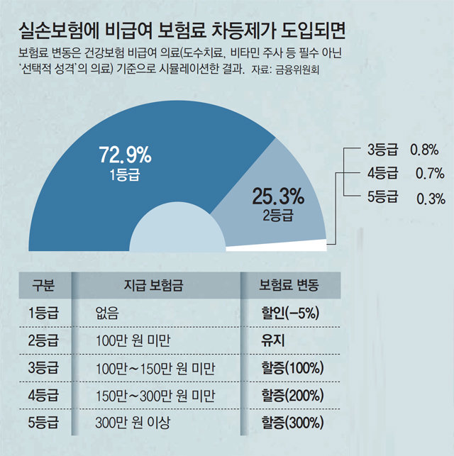 내년 7월부터 병원 이용량에 따라 보험료를 더 내거나 덜 내는 식의 새 실손의료보험에 가입할 수 있게 된다. 도수치료 등 선택적 의료 성격의 비급여를 "특약"으로 떼어내고 이용량에 따라 보험료를 내는 차등 보험료가 적용되기 때문이다. 금융위원회는 이 같은 내용의 "4세대 실손보험 개편방향"을 9일 발표했다. 가입자가 부담해야 하는 자기부담금 비율도 올라가고 재가입 주기는 현행 15년에서 5년으로 줄어든다. 1999년 도입된 이후 3번째 대수술을 앞둔 실손보험 개편 내용을 문답으로 정리했다.