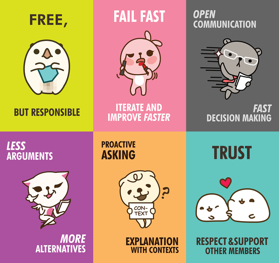 하지만, 경직된 조직에서는 새로운 아이디어는 승인하는 과정에서 단 한명의 No로 반복적으로 진행되지 않다보면, 조직의 성장은 지독하게 더뎌지게 될 것이다. 반대로 대화식으로 서로의 아이디어를 공유하고 함께 개선하다보면 업무와 잡담은 경계를 허물고, 자유로운 상상력을 통해 최고의 시너지를 낼 수도 있다.