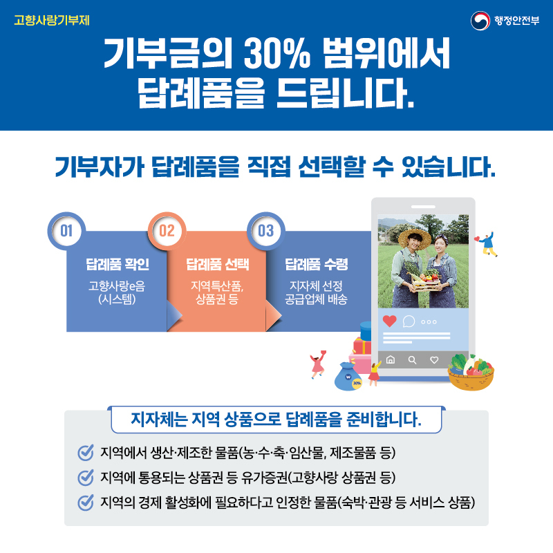 고향사랑 기부제란? 개인이 거주지 이외 지자체(기초, 광역)에 기부하면, 세액공제 혜택과 답례품을 제공하는 제도