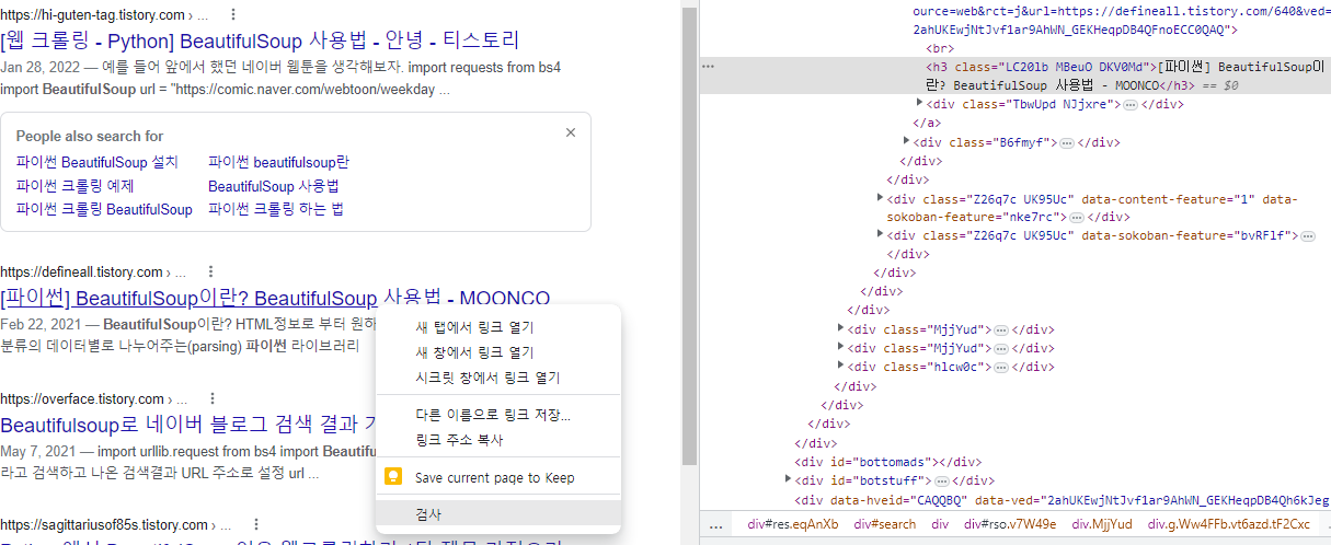 1. "크롬브라우저(대부분 브라우저 지원) 에서 F12 를 누르면 개발자 도구가 나온다. 그상태에서 크롤링할 게시글의 게시물을 오른쪽 클릭하여 '검사'를 클릭하면, 자동으로 해당 elemenet를 표시해준다." 이정도의 개발자 도구 이용 지식.