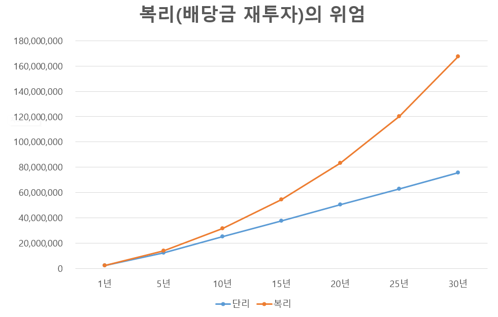 특히, 30~40대에서 15년~20년간 투자한다면, 배당금을 재투자하여 복리의 효과를 누리실 수도 있습니다.