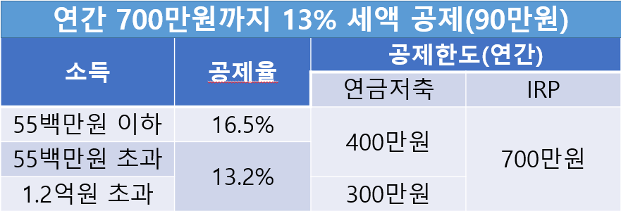 40대가 되면 15년 이후에 있을 퇴직고민을 하게 됩니다. 15년 이후면 해당 돈을 사용할 수 있기에 묶인 돈이라는 생각보다는 미래 은퇴를 위한 종잣돈 모으기라고 생각됩니다. 게다가 매년 700만원 납입 기준으로 대략 90-만원의 세금을 절약할 수 있어, 610만원으로 700만원 납입 효과를 본다고 생각하면 됩니다. 13.2%의 세금 공제는 요즘 예금리가 아무리 높아도 4~5%인 것에 대비 아주 높은 이유입니다. 주식투자를 했더라도 안정적으로(100%) 13% 이익내는 것은 쉽지 않습니다.