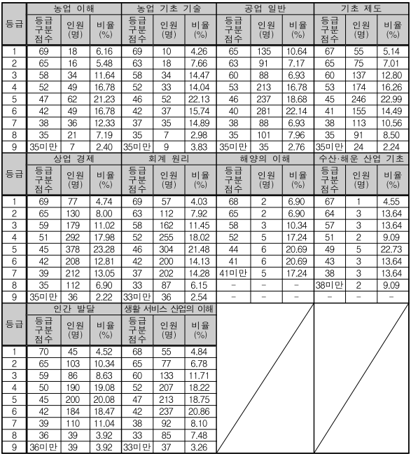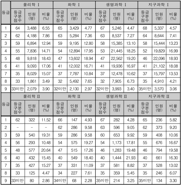 과학탐구 등급별 컷 점수