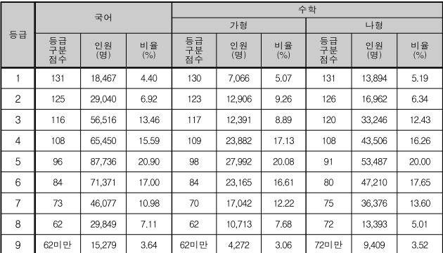 국어, 수학 등급별 컷 점수