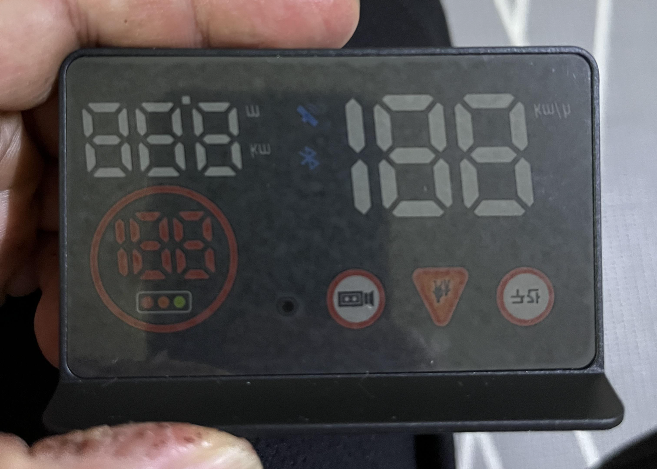 와이프가 나이가 70넘으신 우리 부모님의 안전 운행을 위해 차를 바꿀순 없지만 운전에 도움이 되게 헤드업 디스플레이를 구매해주었습니다. K9, SM9 등 고가 차량에는 네비게이션 정보가 보기 편하게 운전자 전방 유리에 보여준다는 말을 들은 적이 있어서 아래와 같이 기본적인 속도, 주유량, 방향 정보, 과속방지 카메라 정보 등이 있을 것이라고 생각했습니다.