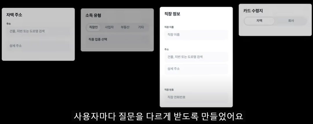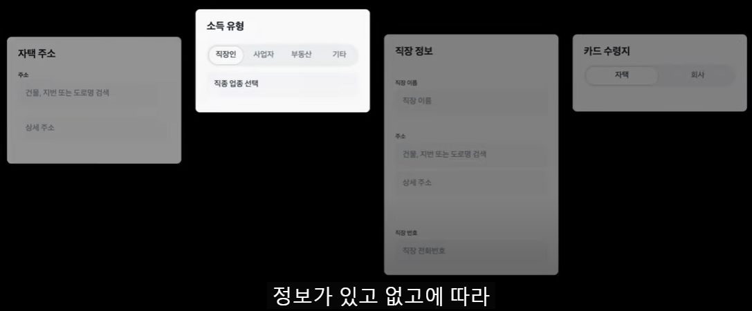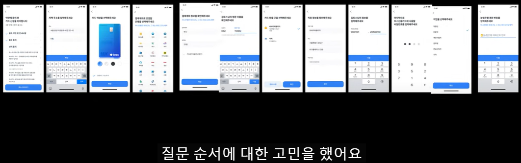 토스는 지점이 없는 인터넷은행입니다. 은행에 가면 어떤 유형의 고객이 오더라도 동일한 양식으로 카드 개설, 계좌 개설 등을 합니다. 은행원분이 필요한 정보입력란을 형관펜으로 표시해 주기 때문에 어렵지 않습니다. 하지만 이런 양식을 온라인으로 입력하려면, 우선 엄청난 입력칸에 60% 고객은 이탈할 것입니다. 30% 고객은 무슨말인지 몰라 포기할 것입니다. 그래서 토스는 꼭 필요한 질문만 받아야 사용자가 큰 고민 없이, 중도에 포기없이, 혼자서 신청서를 작성할 수 있다고 생각했습니다. 사실 신청과정이 어렵다면, 토스는 유입이 발생할 수 없는 구조이기에 더욱 절실하게 신청과정이 Simple하도록 노력했습니다.