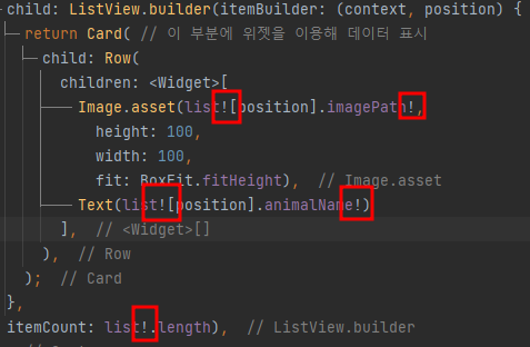 아래의 문법을 활용해서 Card안에 이미지, 텍스트 위젯을 코딩하면 됩니다.
