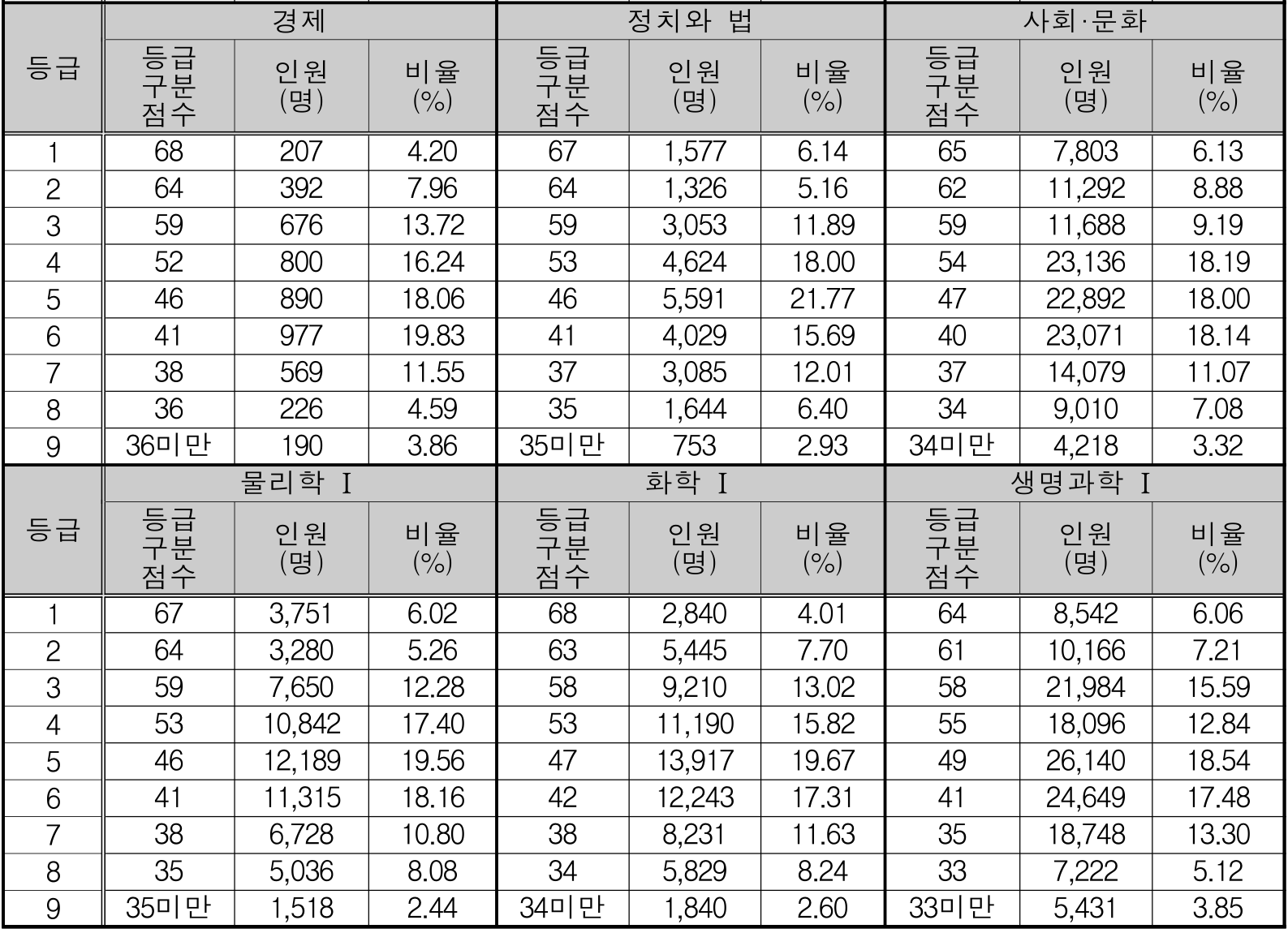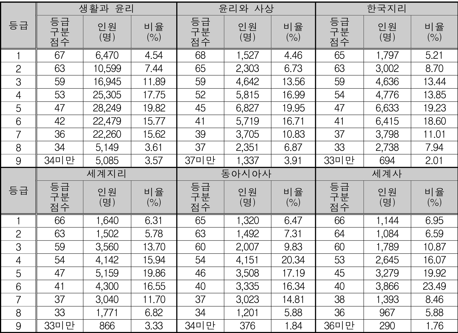 2024학년도 사회, 과학 등급별 컷점수