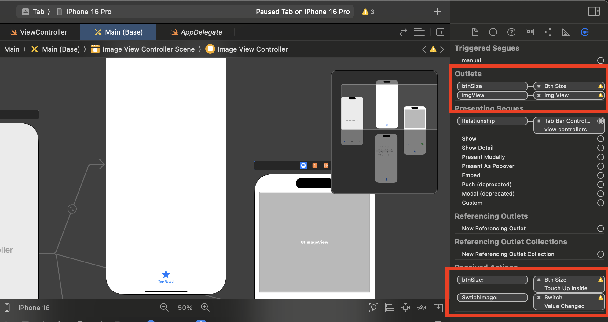 확인하려면, Xcode에서 Triggered Segues에 링크가 깨져서 노란색으로 경고를 띄워주는 것을 발견할 수 있다. 이것을 다시 만들어서 정의해 주면 된다.