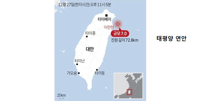 2024년 4월 3일, 대만 동부 화롄(花蓮)에서 규모 7.2의 강진이 발생했음. 25년 만에 가장 강력한 지진이었음. 그리고 불과 8개월 뒤인 2024년 12월 26일, 다시 규모 6.4의 지진이 대만을 강타함. 2025년에도 12월 17일 규모 6.7의 지진이 발생하며 대만의 지진 리스크가 현실화되고 있음.