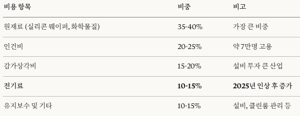 그동안 TSMC의 경쟁력은 단순히 기술력만이 아니었음. 저렴한 전기료가 핵심 무기 중 하나였음. 반도체 팹은 24시간 365일 가동되는 전력 집약적 산업임. TSMC는 연간 약 200억 kWh의 전력을 소비하는데, 이는 대만 전체 전력 소비량의 7%에 달함. 전기료가 1원만 올라도 연간 200억원의 비용 증가로 이어짐.