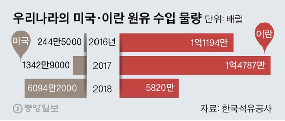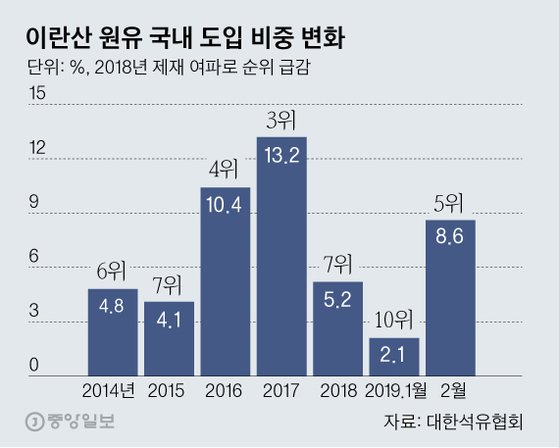 22일 대한석유협회와 한국무역협회 등에 따르면 지난해 국내에서 수입한 이란산 원유는 39억2900만 달러다. 이것은 2017년보다 약 50% 감소한 것이며, 우리나라가 총 수입하는 원유에서 차지하는 비중은 2017년 13.2%에서 2018년 5.2%로 줄었다. 2017년만 해도 이란은 세 번째 원유 수입국이었지만 지난해에는 7위로 떨어졌다.