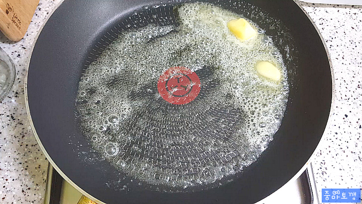 - 중불로 달궈진 팬에 버터 2스푼을 녹입니다.(불이 세면, 탈 수 있으니 약하거나 중으로..)