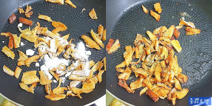 - 버터가 잘 베였다 싶으면 설탕을 넣어 살짝 더 볶아 줍니다.