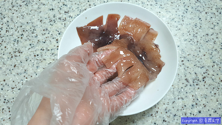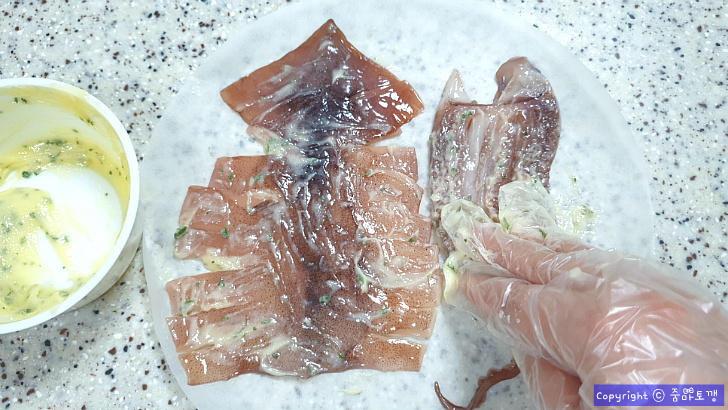- 위생장갑을 끼고 버터양념을 오징어 앞뒤로 발라 주세요!!!(깔끔하게 만드시려면 껍질을 벗기시면 더 좋아요)