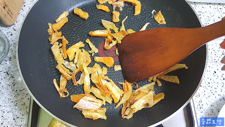 - 버터가 녹으면 손질한 황태채를 넣고, 노릇노릇하게 볶아 줍니다.