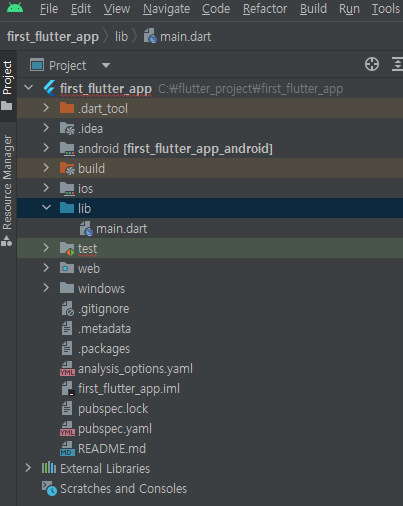 | first_flutter_app.iml | 파일이 자동으로 생성될때 만들어지는 폴더 위치 | |